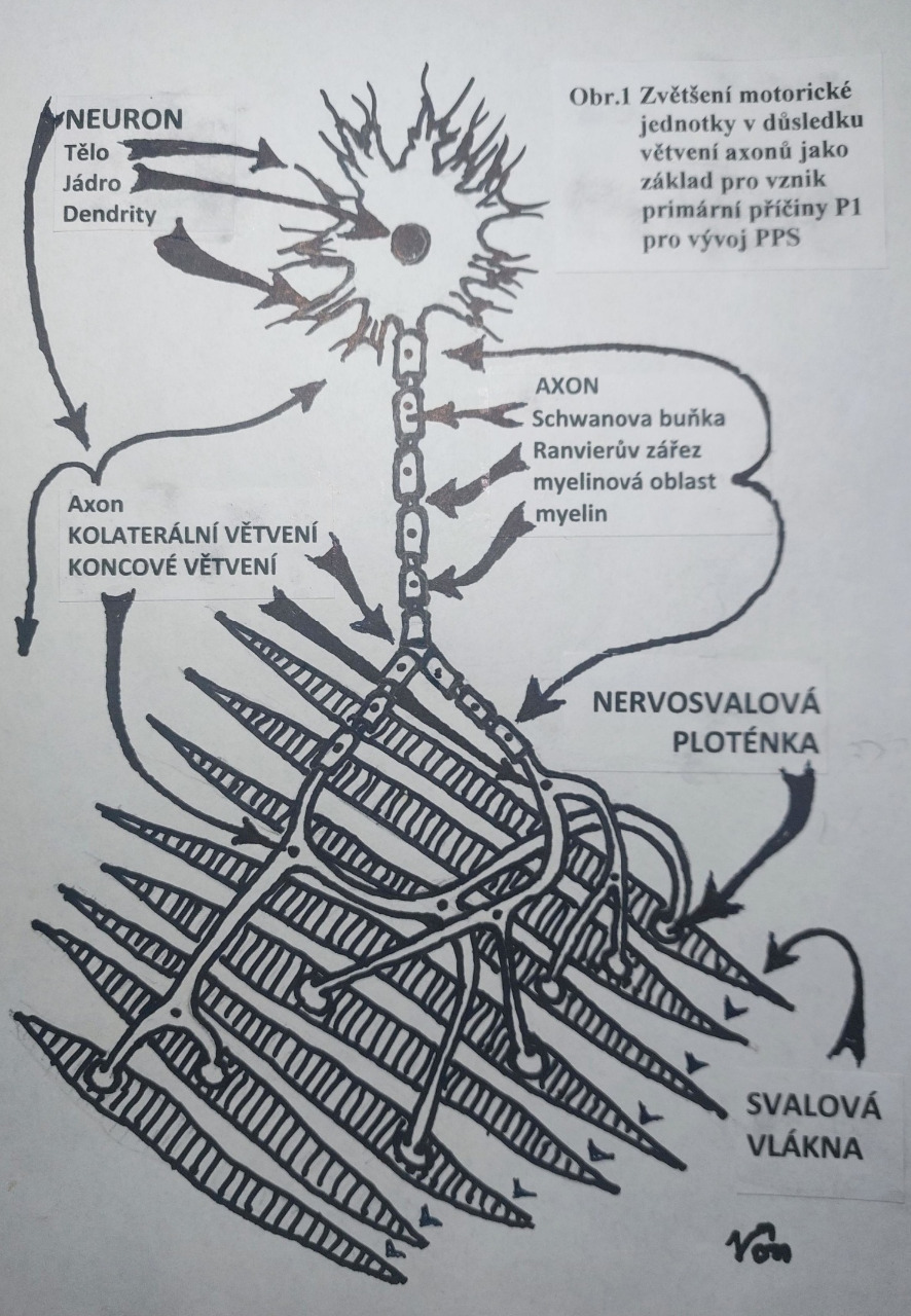 Za (P0) PPS se považuje smrtící účinek poliovirů na neurony inervující kosterní svalstvo, který vyvolává paralytickou formu DPO. Zatímco za (P1) se považuje nedokonalost rekonvalescenční úpravy přeživších neuronů (obr.1), která zvětší počet inervačních konců axonů a umožní vznik velkých motorických jednotek, v nichž na jeden upravený neuron připadá mnohem větší počet inervovaných svalových vláken. To vede sice k dočasné kompenzaci poškození, ale současně také vyvolá vyčerpání přetížených neuronů končící až jejich smrtí (P1). Tyto změny pak odstartují celou škálu následků začínající zeslabováním a úhynem svalových vláken.