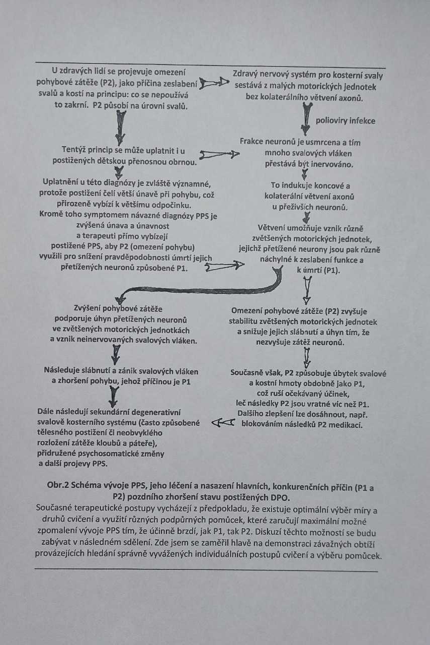 Skutečnost, že obdobná smrt neuronů z vyčerpání provází také stárnutí u zdravých lidí naznačuje, že mechanizmus směřující k vyčerpání činnosti neuronů se realizuje i nezávisle na počátečním působení virů. Stačí možná, aby byl jakkoli narušen proces neuronové komunikace se svalovými vlákny např. stárnutím buněk, působením jiných virů či různých jedů. Virová infekce usmrcující neurony by mohla tedy být pouze jednou z více možností spouštějících tento, jen dočasný, ozdravný mechanizmus. Přetížení neuronů pohybem, respektive zeslabení jejich účinku a následná smrt, jsou bezprostřední příčinou úbytku nejen svalové hmoty, ale pomaleji také hmoty kostí. Na tyto následky navazují další změny uváděné ve výčtu symptomů PPS (obr.2). Mezi nimi dominují degenerativní procesy kosterně svalového systému a dále řada psychosomatických změn. K nim dochází druhotně v navazujících příčinných řetězcích (často např. v důsledku asymetrického postižení svalů a nerovnoměrné zátěže). To ovšem neznamená, že vedle uvedené (P1) se nemůže uplatňovat ještě jiná konkurenční příčina (P2) srovnatelného významu, která se může podílet na prohloubení pozdních negativních následků zhoršujících pohyblivost či průvodní pocity postižených podobným způsobem. Nápadné jsou veliké rozdíly v postižení jednotlivců a ve vývoji symptomů, což klade velké nároky na volbu terapií a variaci jejich postupů a dávek. Současná strategie léčení PPS se zaměřuje na hlavní symptomy PPS a snaží se je potlačit většinou bez medikace, pouze s využitím např. pohybových cvičení, vodoléčby, polohování, masáží a nastavením životního stylu. Pouze v případě bolesti (c) je doporučení šetrného využívání analgezie běžné.